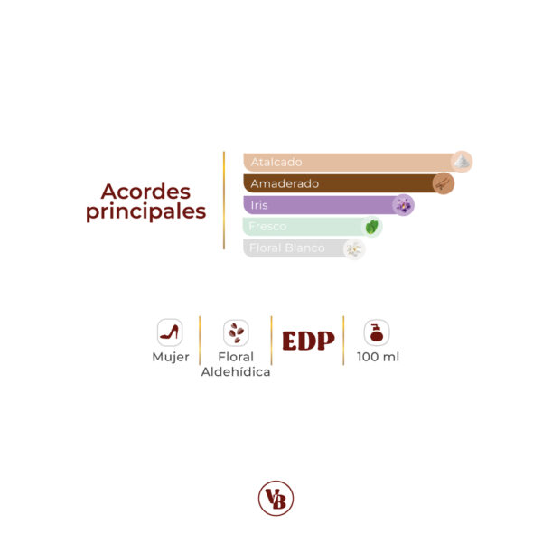 - Notas de corazón: Iris, jazmín, rosa y lirio de los valles (muguete).