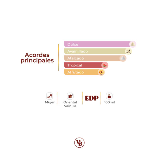 - Notas de corazón: Acorde goloso y frutas tropicales.
